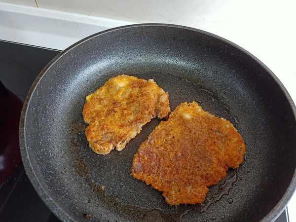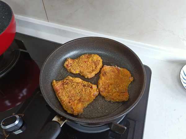 平底鍋內加入適量油,放入“過三關”後的牛排,中小火煎至兩面金黃。
