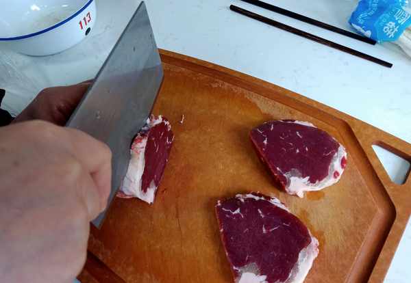 如果是直接買的片狀的牛排,這一步可以省略,一般是已經敲打變薄過瞭。