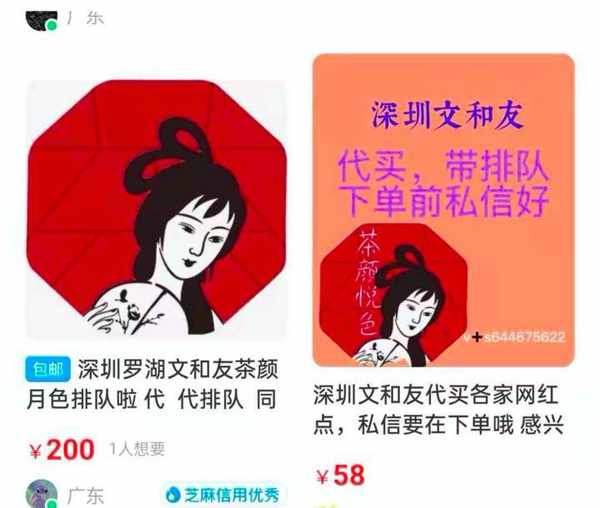 在閑魚上,在深圳文和友代購茶顏悅色或是代排隊的價格分佈在 50-200 元不等。