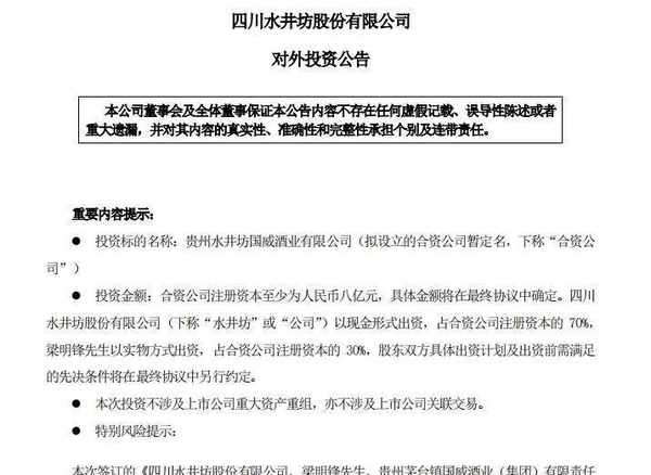 新聞主題是,4月9日晚間,水井坊發佈瞭一則《對外投資公告》,宣稱將以現金方式到醬酒核心產區茅臺鎮進行產業鏈整合,而水井坊選擇的合作企業是國威酒業。