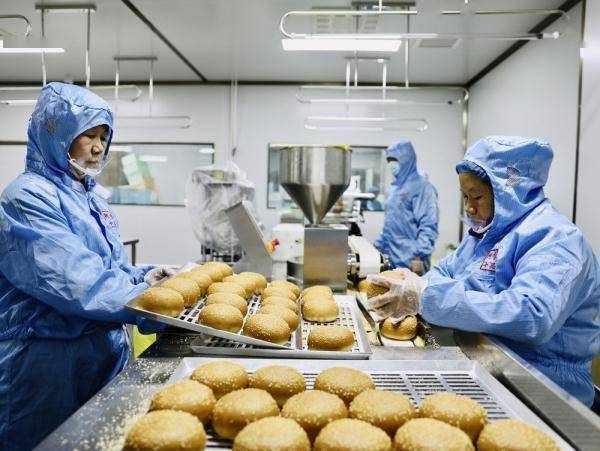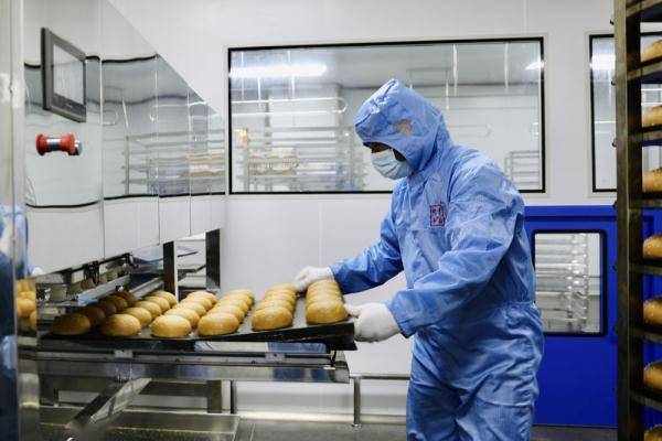 ↑4月12日,在寧晉縣河渠鎮馬房村一傢食品生產企業,工人正在加工面包。(趙一婕 攝)