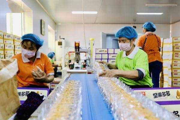 ↑4月12日,在寧晉縣河渠鎮馬房村一傢食品生產企業,工人正在打包餅幹。(趙一婕 攝)
