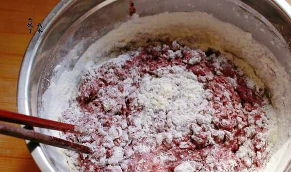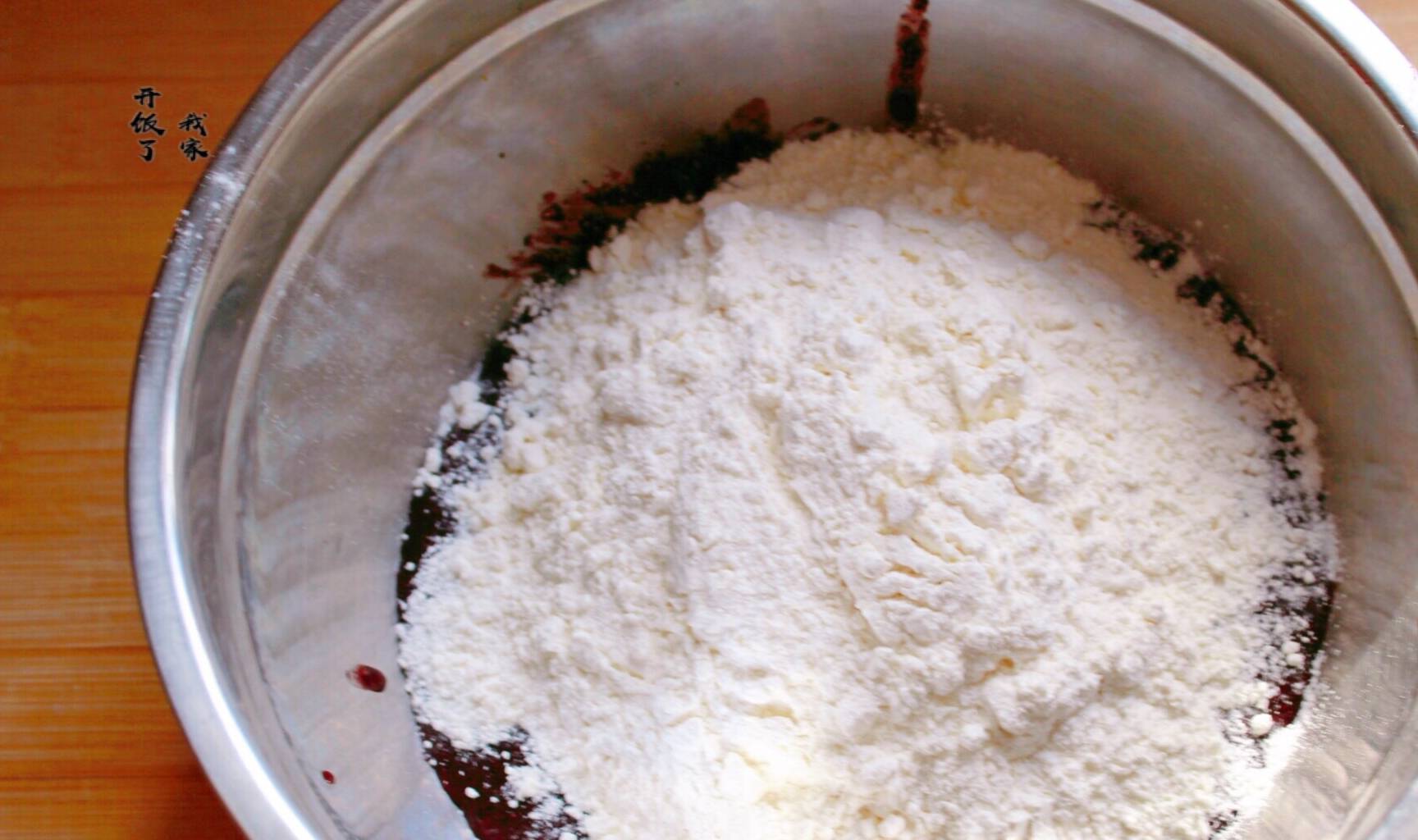 4.接著放入酵母和面粉,面粉的用量是黑米漿糊的2倍。
