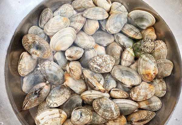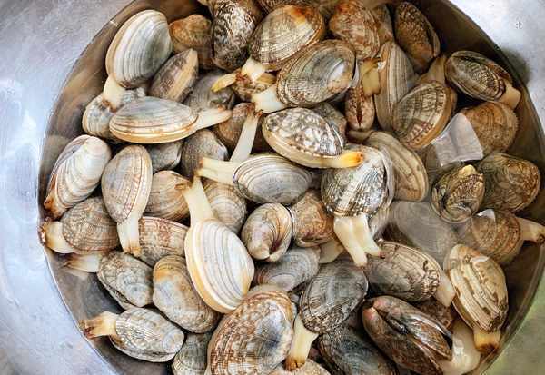 1、蛤蜊放入海水中浸泡5個小時左右,讓它吐盡泥沙,用清水洗凈。