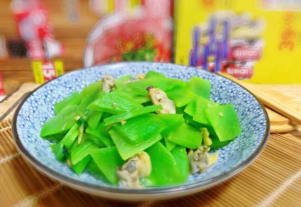 7、炒好的萵筍、蛤蜊裝盤上桌。