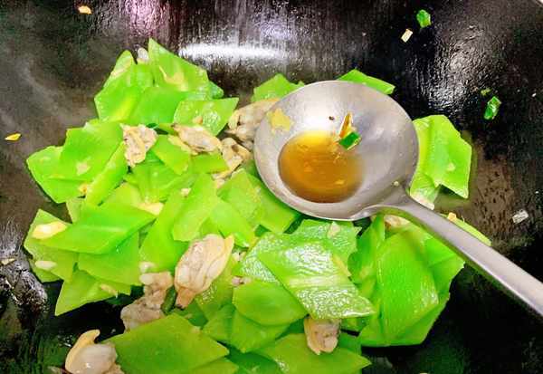 5、炒至萵筍片微微變軟,顏色開始透明,把蛤蜊肉倒入鍋中,加適量的鹽調味,快速翻炒均勻。