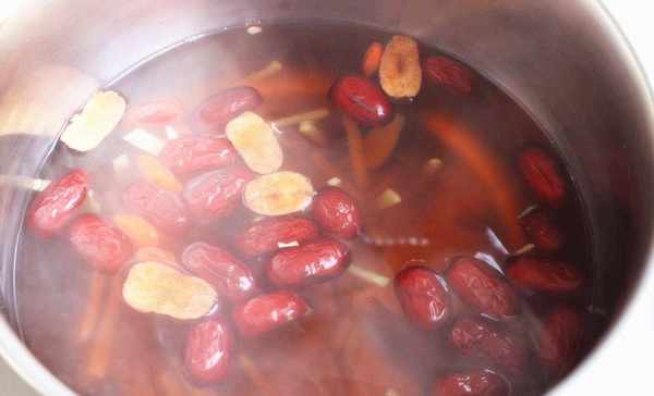6、我們在鍋中加上足夠的清水,然後開始生薑紅棗水,先開稍微大一點火將生薑紅棗水翻滾兩次,讓食材逐漸的發揮作用並且融化開紅糖,等鍋中水變成棕紅色之後我們轉成小火慢熬一下生薑紅糖水。