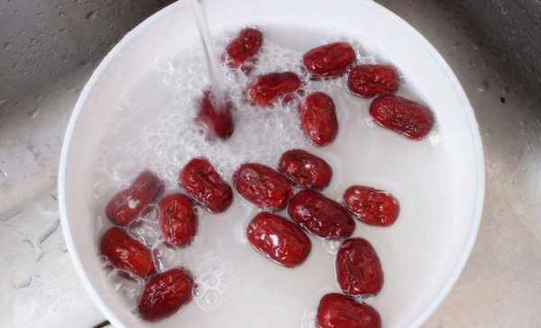 2、在紅棗中加上溫水,我們仔細搓洗一下隨後浸泡一會紅棗,將水倒掉之後反復沖洗幾次。