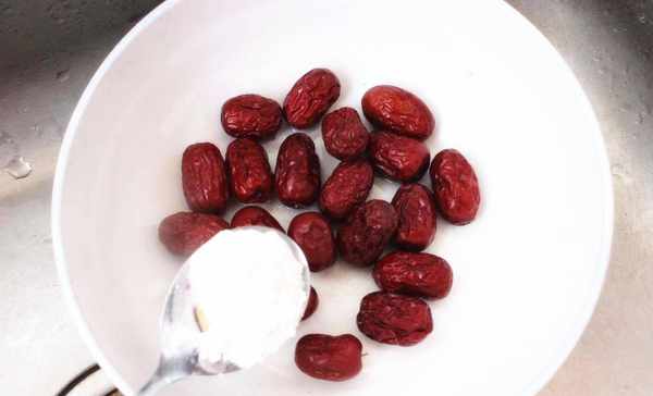 1、首先我們將紅棗放入碗中,隨後我們在碗中加一點食鹽和小蘇打,因為我們要將紅棗都徹底清洗幹凈,因此能徹底去除煮水用的紅棗裡面的臟東西。所以將紅棗下鍋煮生薑紅棗水之前,將紅棗反復搓洗幹凈就可以瞭。