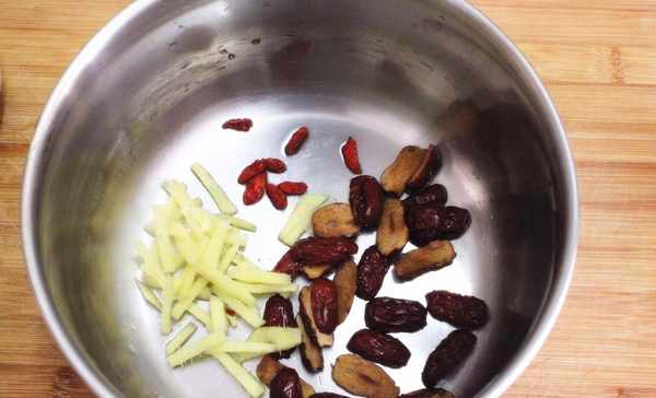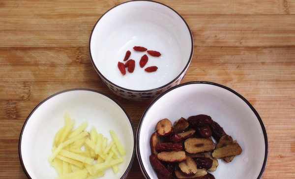 3、將新鮮的生薑切成細條,隨後我們加上切片的紅棗以及少許的枸杞。