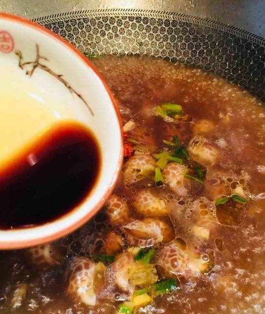 4.花螺倒入鍋中,加入適量生抽白酒,