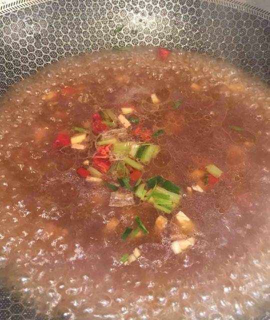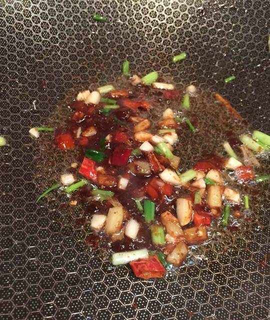 2.熱鍋中倒油,爆香薑蔥蒜,再入幹辣椒,翻炒均勻,倒入豆瓣醬炒出紅油,