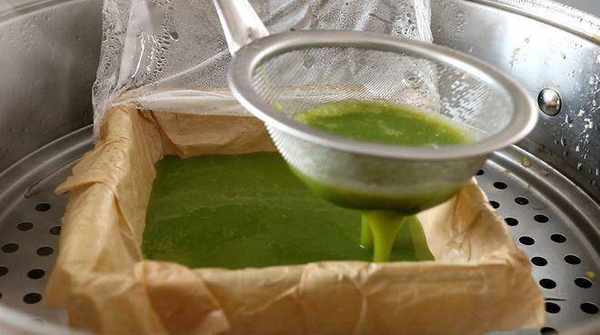 6、 接著拿出來再倒入菠菜汁的雞蛋液,上鍋蒸至定型;