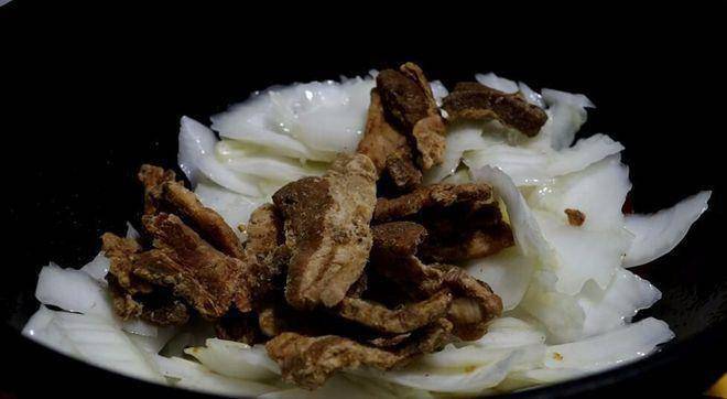 6、 接著將豬血倒入一起翻炒,加入適量的鹽、糖、生抽和老抽一起炒至入味;