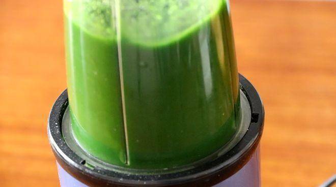 2、 鍋中加入適量水燒沸,水開將菠菜焯一下水,焯好水後放進料理機中,稍微加點水給它打成菠菜汁;