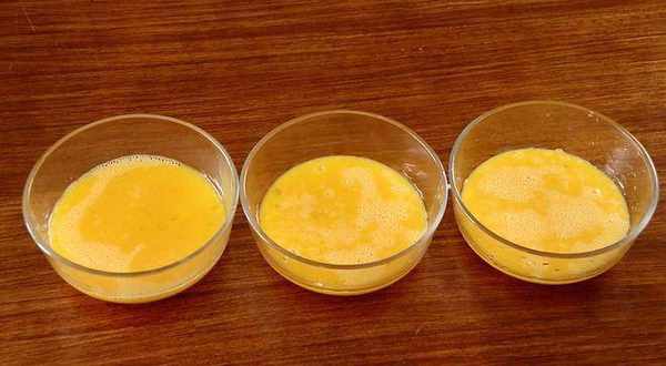 4、 準備三個碗,裡面分別打入相等分的雞蛋,攪散,分別將打成的蔬菜汁,倒入兩個雞蛋液裡面,用筷子攪拌均勻;