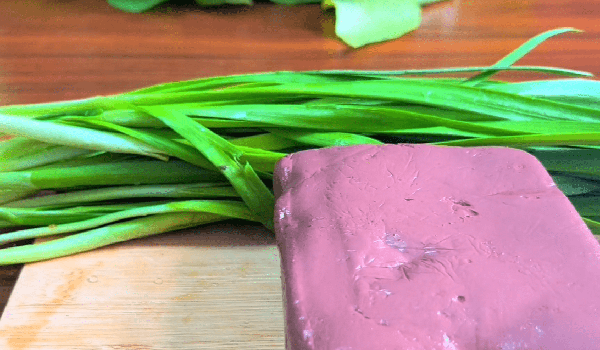 準備食材:韭菜、豬血、料酒、鹽、生抽、老抽、生薑、小米辣