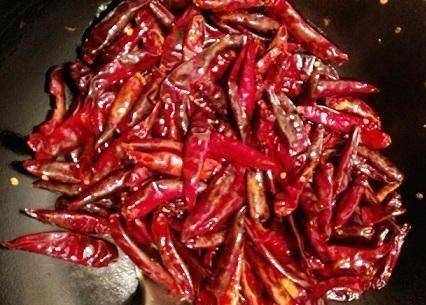 1.鐵鍋去水,將幹辣椒放入鍋中炒香,然後用石臼搗碎備用。