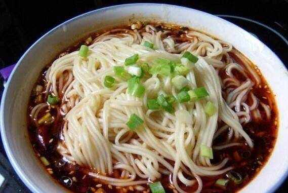 2.燒一鍋開水,將面條和空心菜放進去煮一下,倒入打好調料的碗中,加入蔥花即可。