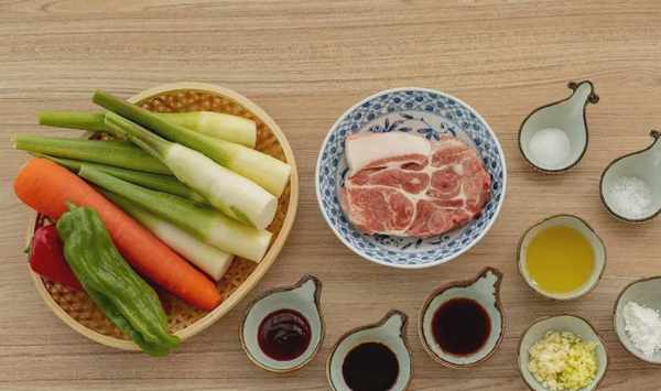 後腿肉/梅花肉150g茭白3根胡蘿卜1根青尖椒1根紅尖椒1根生薑1小塊蒜2瓣鹽1小勺糖1小勺生抽1大勺老抽1小勺蠔油1小勺淀粉1小勺食用油2大勺