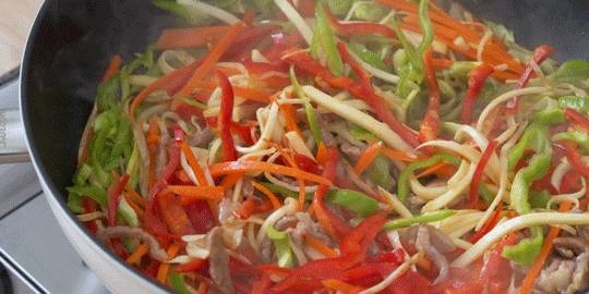 加入胡蘿卜翻炒至變軟,加入青紅椒絲、肉絲翻炒均勻,加入1小勺老抽、1小勺生抽、1小勺蠔油、1/2小勺糖調味,翻炒入味即可出鍋