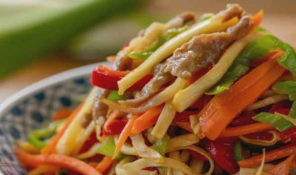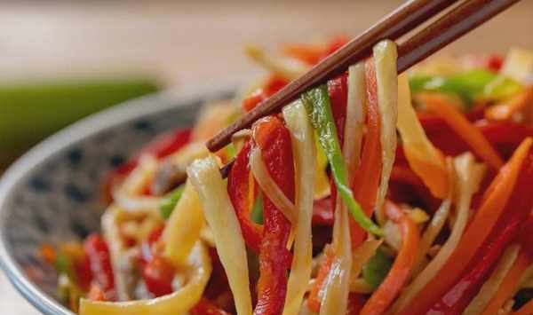 做法簡單,茭白、豬肉、青紅椒、胡蘿卜切絲,按食材易熟程度,逐一下鍋炒制即成。