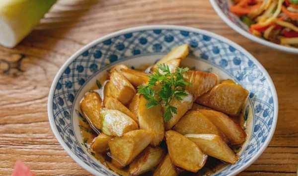 滾刀切塊,糖、鹽、醬、油上色增味,一燜即成。