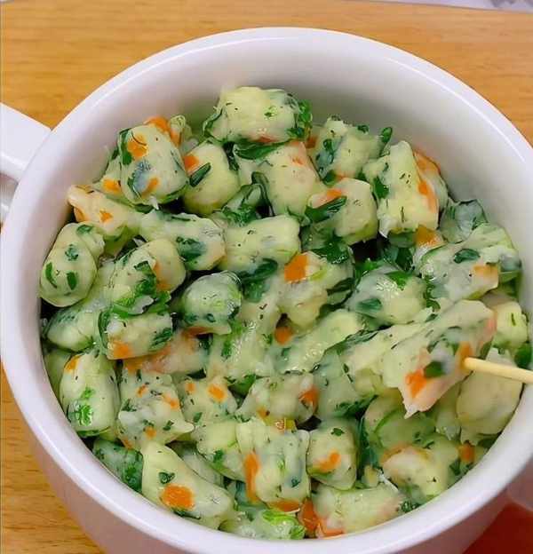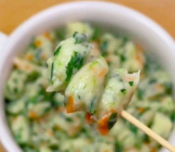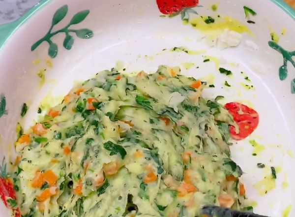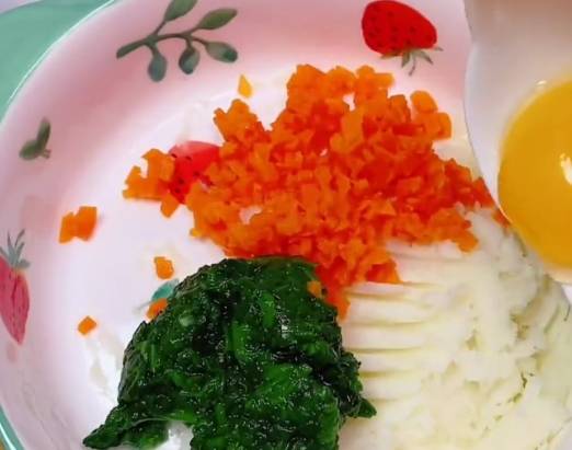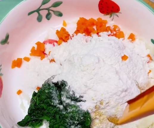 第一步,山藥切塊上鍋蒸熟,趁熱壓成泥,叫焯水的蔬菜碎,紅蘿卜,或者菠菜葉都可以哦,一個蛋黃,2勺面粉,撒調味粉。