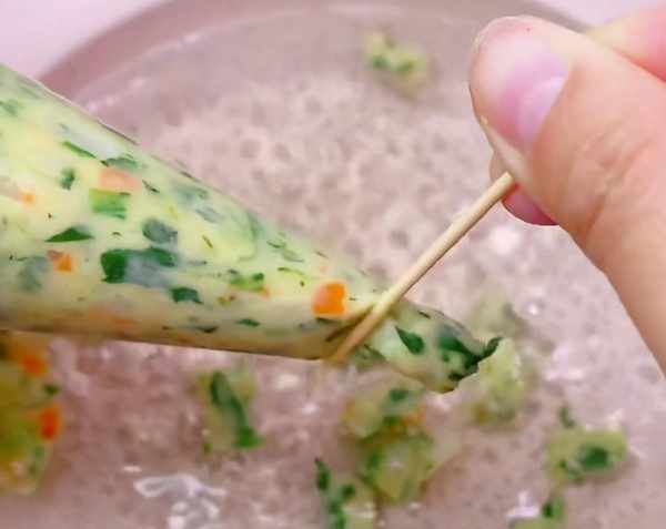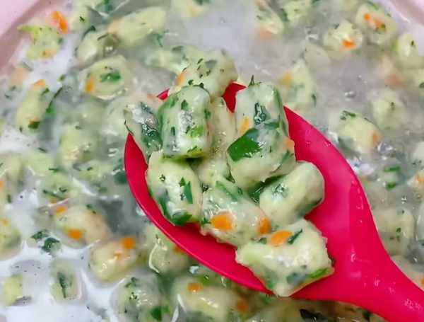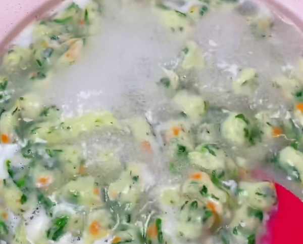第三步,水燒開後,擠壓裱花袋,快速到水中,飄起以後煮三分鐘即可。