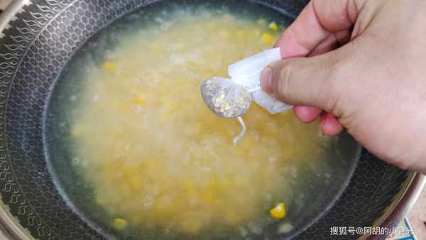 第四步:全部準備完畢後,將玉米粒和馬蹄碎全部回鍋,倒入剛剛煮玉米的湯水中,根據口味加入冰糖,有條件的用紗佈包裹一把幹桂花加進去一塊煮。