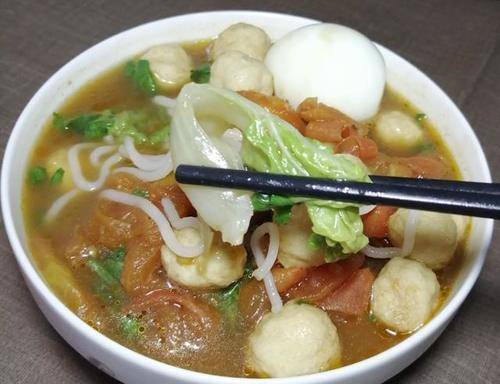 如果你想知道如何制作美味簡單的米粉,這也是一種用西紅柿和甜面醬自制的米粉湯。醬汁香氣濃鬱,酸度清爽開胃,很容易讓你食欲大開。粽子和胡椒粉的組合非常完美。