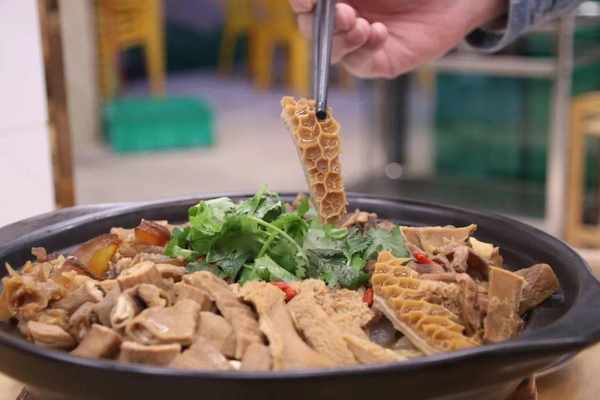 用大火加熱鍋中的配料大約半小時,然後用小火煮一個半小時。當我們看到鍋裡的牛肉和牛肉雜項煮到酥脆而不腐爛時,我們可以在鍋裡加入糖、鹽、醬油、味精和白酒。