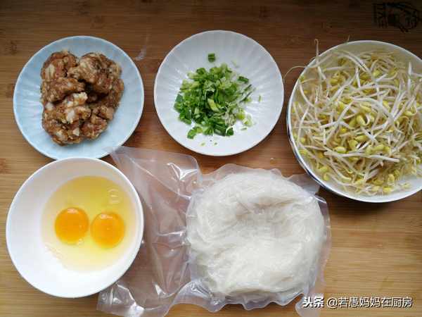 1包雲南米粉,準備兩個雞蛋、一些肉餡、黃豆芽和蒜苗。如果你喜歡其他配菜,你也可以加更多。