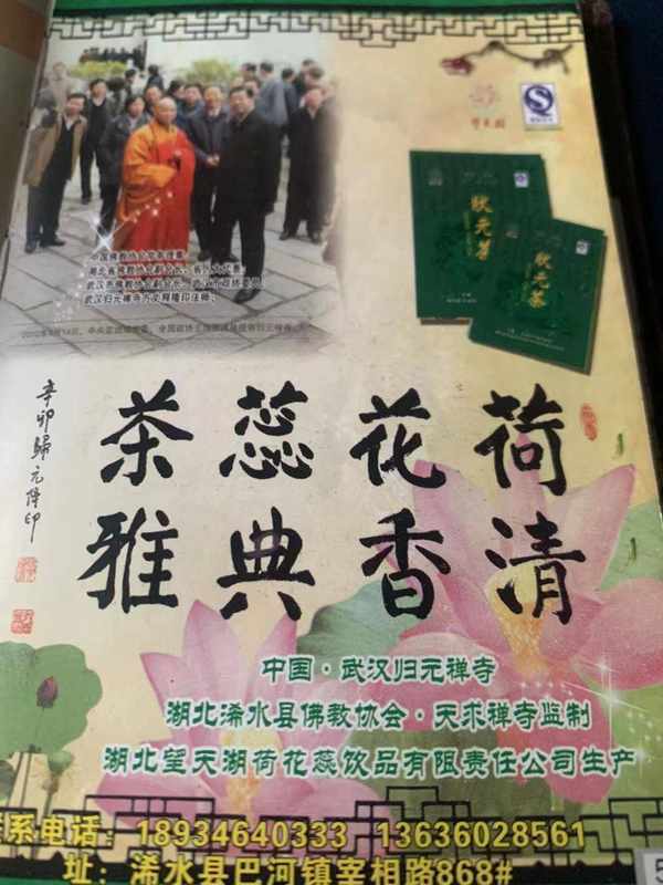 2022年6月25日全縣各鄉鎮負責人、縣直各單位"一把手"拉練參觀現場會,付書記在巴河鎮地標優品館的展臺前他右手指著"望天湖"牌荷花蕊茶深情地說:"我很喜歡喝這種荷葉茶⋯"並叫展臺工作人員泡瞭一杯,一股清香撲鼻而來。"荷葉茶值得做大做強!"這是付書記向大傢說的真心話。近幾年來,望天湖牌荷花蕊茶先後多次獲得"大別山名優產品銀獎"、"第十屆武漢農博會金獎"、"黃岡市地標優品""非物質文化遺產"等稱號;多次被省、市、縣電視臺和黨報黨刊的宣傳報道;多次得到各級領導的認可,特別是原中央政治局常委、全國政協主席賈慶林一行視察武漢歸元禪寺時品飲荷花蕊茶時頷首贊許;中佛協常務理事、歸元禪寺方丈隆印欣然題詞:"荷花蕊茶.清香典雅"縣委辦、政府辦、政研室、發改委都把"望天湖"荷花蕊茶的插圖放在"通訊錄"和"發展規劃"中。原縣委宣傳部閆吉部長即興題詞:"觀荷品茗謙君氣,作對吟詩雅士風"。