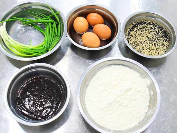 把蔥花切成蔥花;4個雞蛋;一小碗甜面醬;白芝麻和黑芝麻。