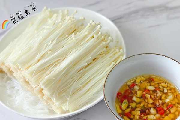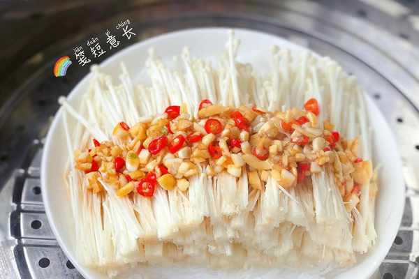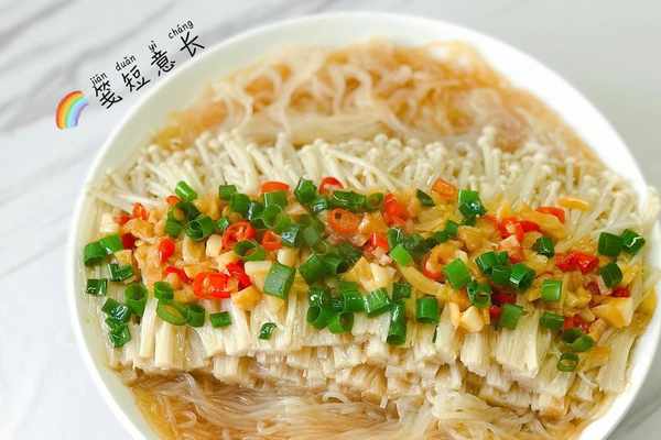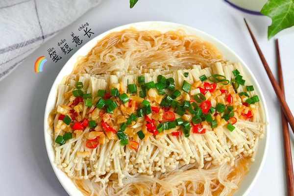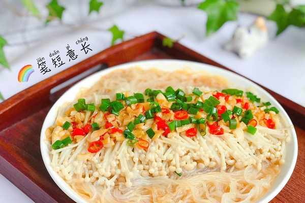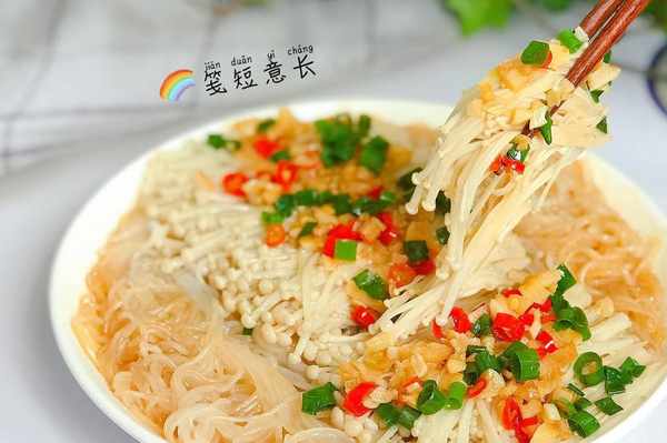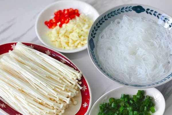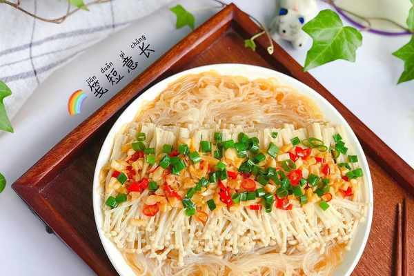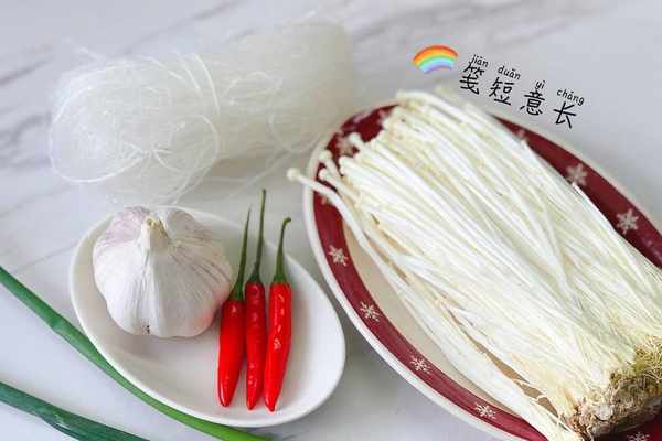 蒜蓉粉絲金針菇:所需食材:金針菇300g、粉絲1把、小蔥2根、大蒜1頭、小米辣3根