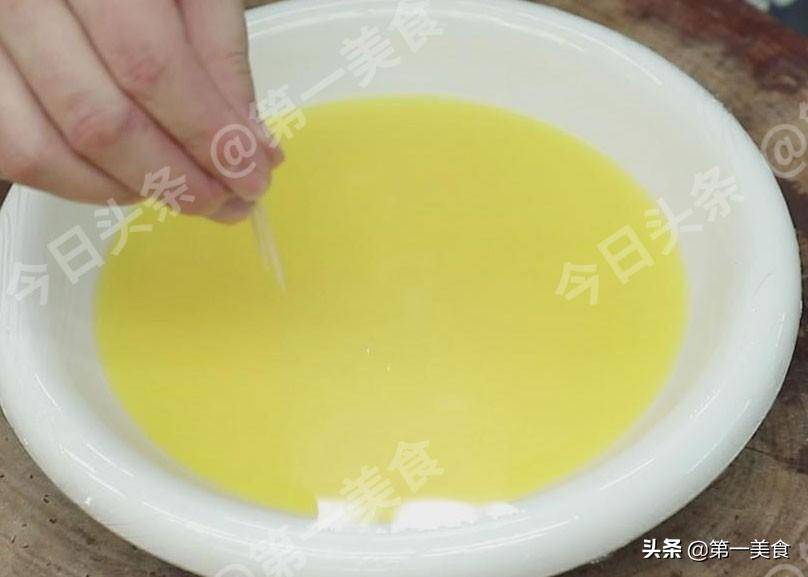 然後在水中加入2克鹽以增加基本風味。用筷子把雞蛋打碎,讓蛋清和蛋黃均勻地混合。倒入準備好的鹽水。