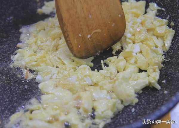 打幾個雞蛋,撒上一些鹽,攪拌均勻,在鍋裡加更多的油,把雞蛋炒香。煎完雞蛋後,把它們切碎,然後把它們和胡蘿卜和面條放在一起。