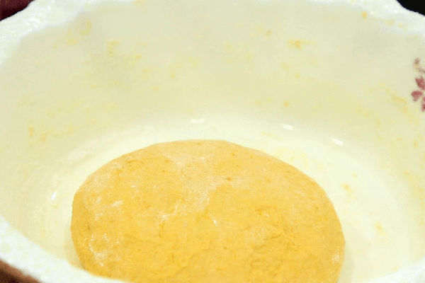 蒸好南瓜後,把它壓成糊狀。如果你喜歡甜食,你可以加一些蜂蜜。將南瓜泥倒入碗中,加入面粉和面團,面粉與南瓜的比例為1:1。混合後,蓋上蓋子,發酵1小時。