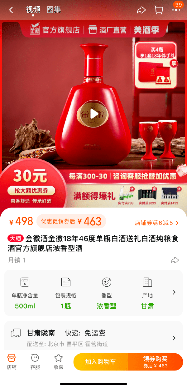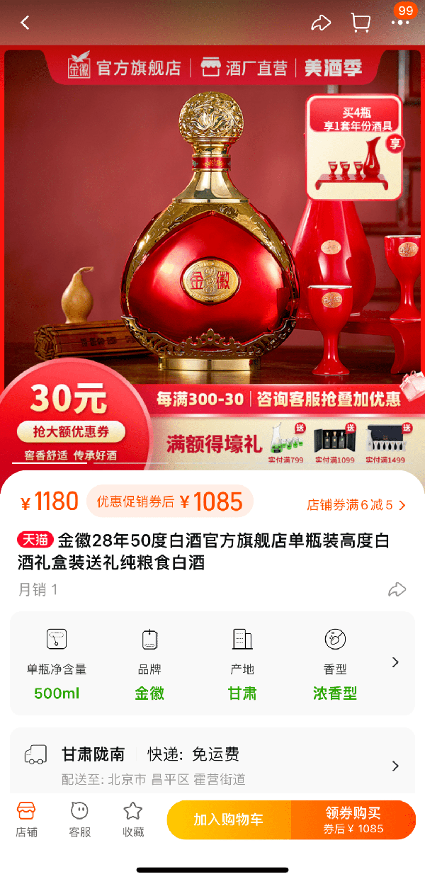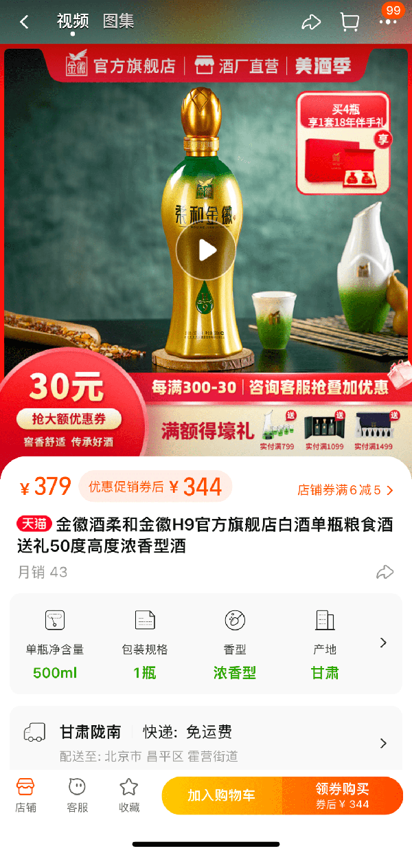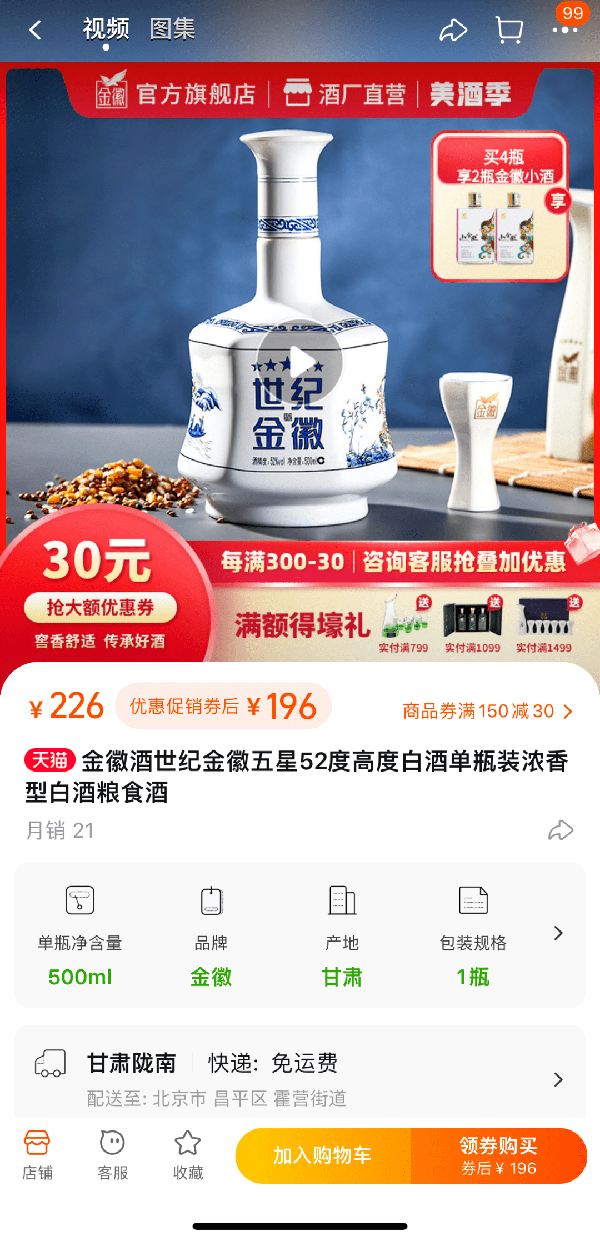 旗下高檔白酒金徽28、金徽18、世紀金徽五星、柔和金徽H9單瓶產品定價分別1085元、463元、196元和344元,然而前兩款白酒在金徽酒天貓旗艦店的月銷量僅有1瓶,世紀金徽五星和柔和金徽H9月銷量分別為21瓶和43瓶。