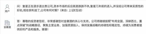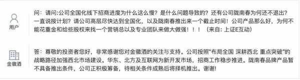 在投資者互動平臺上,有投資者質疑企業和復星系的合作。“復星幾年前進入並沒有給公司帶來實際好處,市場的反應就是跌跌不休。”對此金徽酒方面回應,“佈局全國、深耕西北”的戰略路徑不變。