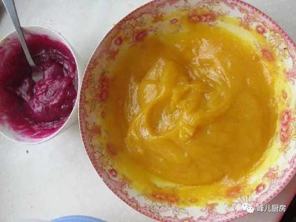 峰兒提示:把水果打成泥很稀,必須加入適量的淀粉,到能裱花的狀態才可以。
