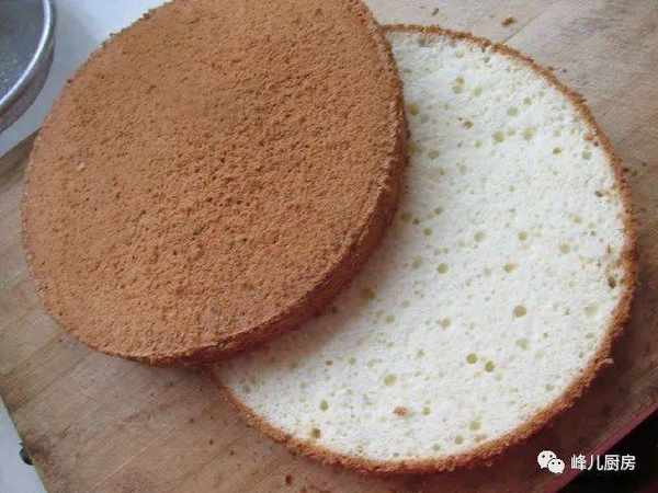 7、把蛋糕拿出來再振動一下,目的是防止蛋糕回縮,晾一會兒涼透瞭,再上下分割成兩片。