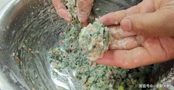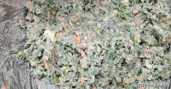 2、放到案板上切成碎末,切的時候有一股淡淡的野菜的香味,放入一個幹凈的大盆中,加入少許的蔥花,少許的胡蘿卜丁,再放入少許的火腿丁,再來點蝦皮或者是海米都可以。打入一個雞蛋,適量的雞精,少許的味精,再加入一丟丟的食用鹽,再加一點五香粉,加入一把面粉,再加入一把淀粉。攪拌均勻,粉不夠的話,可以多加一點,再加入少許的食用油,再次攪拌均勻就可以瞭。
