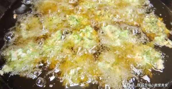 4、丸子下入鍋中之後,我們不要輕易的翻動它,定型之後再輕輕的翻動,不然容易散掉,炸出來成品不成型。