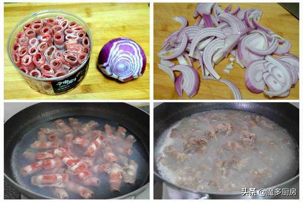 1.準備一磅牛肉片和一個紫色洋蔥。首先,將紫色洋蔥切成小條,然後將牛肉片放入沸騰的鍋中。牛肉片變色後,將其取出,放在一邊;