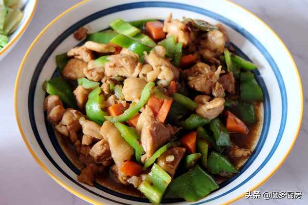 無骨雞腿切成小方塊待用,青辣椒也切成小方塊待用,胡蘿卜去皮切成小方塊備用;