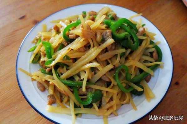 土豆去皮切絲,油炸前用水沖洗幹凈。土豆絲更脆,味道更好。青椒也被切成絲,瘦肉被切成絲並與醬油混合醃制一會兒,使肉更美味、更嫩。用大火加熱鍋,加入少許食用油,先將大蒜切成片,翻炒出香味。然後加入肉絲翻炒變色。如果顏色不夠,可以加一些醬油來增加味道和新鮮度。然後將土豆絲加入鍋中,翻炒至新鮮。用青椒絲和鹽調味,翻炒均勻即可出鍋。