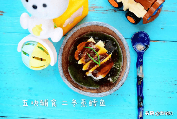 7.最後,將醬汁澆在蒸好的鱈魚上。加水是為瞭降低醬汁中的鹽度,因為嬰兒不能吃太咸的東西。嬰兒吃東西時,隻吃上面的蔬菜和鱈魚,所以盤子裡的湯不必讓嬰兒吃