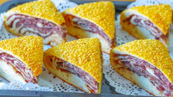 我們的金色煎餅做好瞭。油炸後,顏色非常漂亮,更香。讓我們把它切開看一看,裡面的紅豆餡是一層一層的,層次清晰美觀。